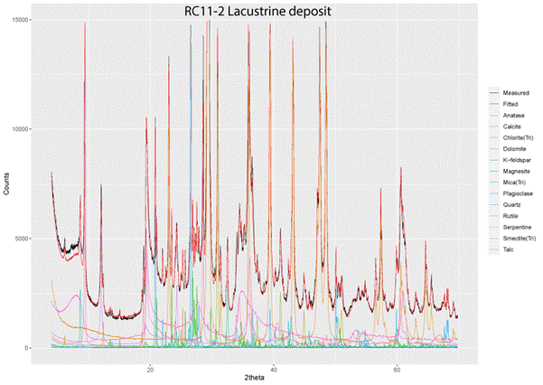 Our method of full pattern fitting has been incorporated into an opensource R package known as ‘powdR’ and all quantitative analyses were done using this package (Butler and Hillier 2021a, 2021b). One of the prime advantages of powdR is that it is much faster than our previous implementation of our methods in Excel. However, perhaps the biggest advantage of our prior determined full pattern fitting method compared to full pattern fitting with the Rietveld method is that the prior determined patterns include their associated background scattering. As such, if an amorphous phase is present, it becomes obvious that an appropriate pattern for it must be added to the fit and it is then quantified in exactly the same way as all other phases based on full pattern reference intensity ratios. There is no need to dilute the sample with an added internal standard to quantify amorphous phases, as must be done with the Rietveld method, but you do need to obtain appropriate reference patterns for the amorphous phases present as different amorphous phases have different patterns. Thus, we were quickly able to determine that RC11-1 and RC11-3 required the addition of amorphous phases, whereas RC11-2 did not.